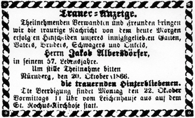 | 1866 | Der Zinngießermeister Johann Jakob Albersdörfer stirbt am 20. Oktober 1866. |