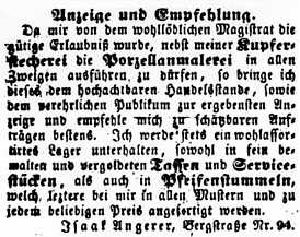 Quellen: Adressbücher Fürth Erhard Schraudolph: Zinnspielwarenhersteller in Nürnberg und Fürth in Paradestücke, W. Tümmels, Nürnberg 2000 Bayerischer Zeitung Nr. 224 v. 31. August 1862 (Google books) Fürther Tagblatt Nr. 123 v. 4. August 1846 (Google books) Fürther Tagblatt Nr. 130 v. 15. August 1849 (Google books) Fürther Tagblatt Nr. 187 v. 6. August 1861 (Google books) Fürther Tagblatt Nr. 188 v. 7. August 1861 (Google books) Archiv Israelitische Kultusgemeinde Fürth (Personalakte) |
