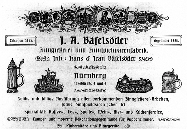 Die Zinngießerei J. A. Bäselsöder stellt auf der Bayerischen Landes-Industrie-, Gewerbe- und Kunstausstellung in Nürnberg 1896 aus und bekommt eine Bronzene Medaille "für gute und geschmackvolle Ausführung von Zinnspielwaren". |