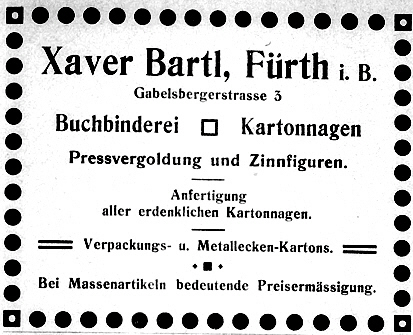 Xaver Bartl ist Inhaber einer Buchbinderei und Kartonagenfabrik in der Gabelsbergerstraße 2. Er befaßt sich auch mit Preßvergoldung und der Herstellung von Zinn- und Bleifiguren. |