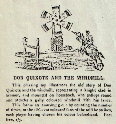 herumgaloppiert und mit seiner Lanze eine bunte Windmühle angreift. Dies