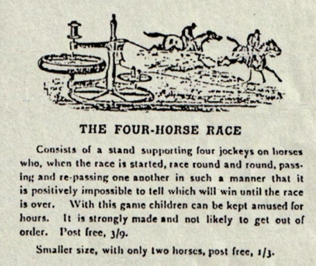 eigentlich ein faires Fersen-Zehen-Rennen. Verpackt in stabiler Holzkiste, frachtfrei 40/-. Es wird auch auf das nicht abgebildete Fahrradrennen hingewiesen: Das mechanische Radrennen - Dieses besteht aus dem gleichen Ständer und Mechanismus wie der Wettlauf, aber statt der Männer, die gehen, sind sie zum Radfahren gemacht. Verpackt in stabiler Holzkiste, frachtfrei 45/-. |