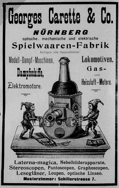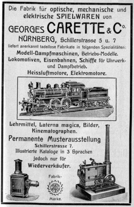 Georges Carette spezialisiert sich auf die Anwendung der Chromolithographie bei dem Bedrucken von Blech. Er stellt Dampfspielzeug, Eisenbahnen mit Zubehör in den Spurweiten 0, I, II und III, elektrische Straßenbahnen, Schiffe, Autos usw. her. |