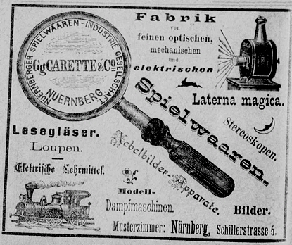 Im amtlichen Bericht steht: "Daß sich unter der Bezeichnung Nürnberger Tand auch manches werthvolle Erzeugniß verbirgt, das schon mehr Anspruch auf die Bezeichnung eines physikalischen Apparates machen kann, zeigte die Spielwaarenausstellung von Georges Carette & Co., Nürnberg. In den drei großen Schränken dieser Firma waren jene mechanischen Modellspielwaaren zur Schau gestellt, welche in immer größerer technischer Vollendung seit den letzten Jahrzehnten in Nürnberg gebaut werden. Kleine Modelldampfmaschinen zeigten uns die Entwicklung und Wirkungsweise des Dampfes. Dabei sind sie, um alle Gefahr zu vermeiden, mit den nöthigen Armaturen wie Wasserstandsglas und Sicherheitsventil ausgerüstet. Lokomotiven aller Art können durch Spiritusflammen in Bewegung gesetzt werden. Dynamomaschinen, Elektromotoren, elektrische Eisenbahnen, Wasserzersetzungsapparate und Experimentirkästen führen den Geist des Knaben in die Welt der Elektrotechnik ein. Schrauben- und Raddampfer mit Takelage und Bemannung stellten eine ganze Handels- und Kriegsflotte vor. Zauberlaternen, Skioptikons und sonstige optische Spielwaaren waren von dieser Firma in reicher Auswahl und bester Ausführung zur Weltausstellung gesandt worden." Von der Ausstellung einer elektrischen Spielzeug-Straßenbahn als erster Aussteller überhaupt ist nichts vermerkt! |