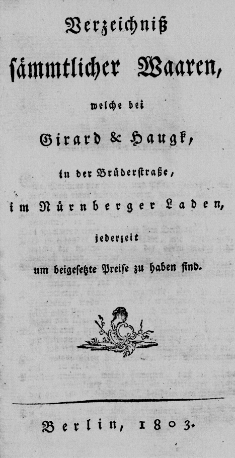 Der Nürnberger Laden mit der Kunst- und Spielwarenhandlung ist von der Firma Girard & Haugk übernommen, die ein "Verzeichniß sämmtlicher Waaren, welche bei Girard & Haugk in der Brüderstraße, im Nürnberger Laden, jederzeit um beigesetzte Preise zu erhalten sind" herausgeben. |