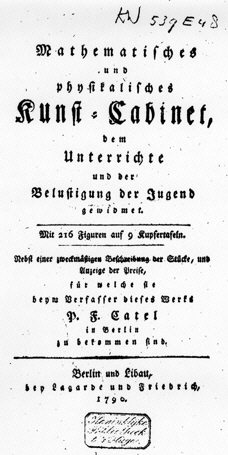 1790 | Peter Friedrich Catel gibt ein "Mathematisches und physikalisches Kunst-Cabinet, dem Unterrichte und der Belustigung der Jugend gewidmet" heraus. |