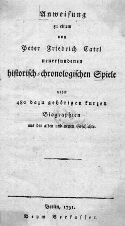 1791 | Peter Friedrich Catel veröffentlicht ein historisch-chronologisches Spiel mit 480 kurzen Biographien aus der alten und neuen Geschichte. |