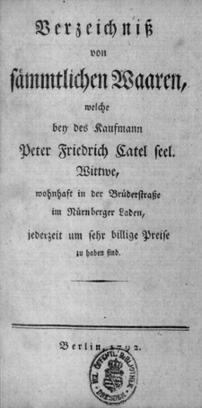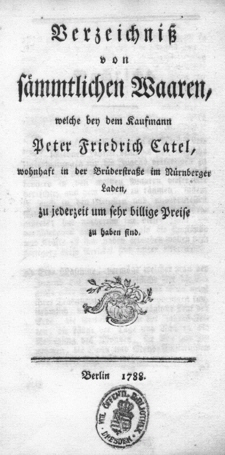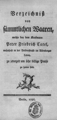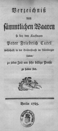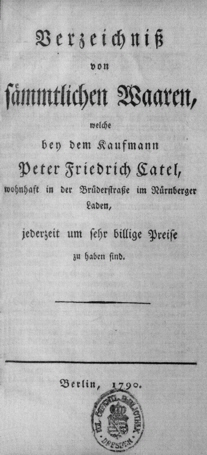 Peter Friedrich Catel stirbt am 9. Januar 1791 an Auszehrung. Die Witwe Elisabeth Wilhelmine Catel, geb. Rousset führt den Laden "unter Aufsicht und Direction eines eben so geschickten Genies, des Hrn. Heitmann [einem langjährigen Mitarbeiter] weiter. | |