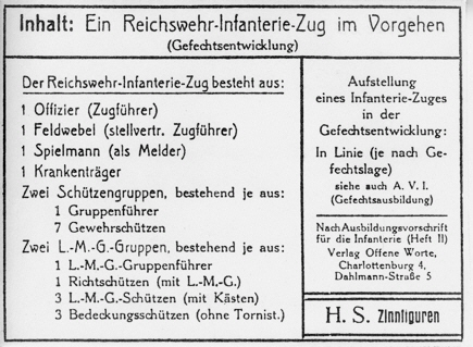Reichswehr-Infanterie -- (Zug) -- vorgehend Abbildung in Gerhard Hellwig: Vierzig Jahre Berliner Zinnfiguren Werner Scholtz 1934-1974, Seite 76 (hier "vorgehend" durchgestrichen und unleserlich überschrieben) |