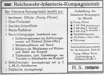 Reichswehr-Infanterie -- (Kompagniestab) im Eigenbestand mit Inhaltsangabe 1 berittener Offizier (Komp.-Führer) (HS 1) 1 Ober-Feldwebel (HS 4) 1 Sanitäts-Unteroffizier (HS 7) 1 Melde-Radfahrer (HS 29) 1 Nachrichtengruppe, bestehend aus: 1 Entfernungsmesser (mit Entfernungsmesser auf Rücken) (Unteroffiz.) (HS 10) 1 Meldehundführer mit Hund (HS 11) 2 Blinkern (mit Blinkkasten auf Rücken und Stativ am Koppel) (HS 9) 2 Telefonisten (mit Gabelstange am Tornister u. Kabeltasche am Koppel) (HS 8) 3 Gefechtswagen (zweispännig) mit je 2 L.-M.-G.-Handkarren (HS24, HS 25, HS 26) 1 Feldküche (zweispännig) (HS 26, HS 27, HS 28) |