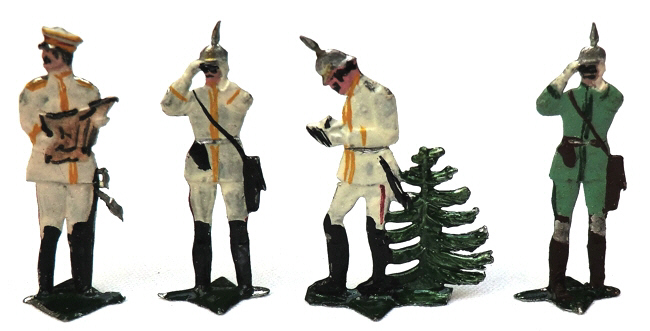 denn ich bin noch im Besitz folgender Figuren: 1. Mann liegend ladend 2. Mann liegend schießend, was auf eine Packung "Infanterie im Gefecht" hindeutet und 3. Fernsprech-Hinterwagen, was mit den Fernsprechern aus Packung 0 und dem Fernsprechtrupp aus Packung 2 auf eine Packung "Nachrichten" hindeuten kann. Interessant ist die Packung 0. Normalerweise fängt man bei einer Reihe mit "1" an. Ist also "0" später eingefügt worden? Oder hat man vorhandene Figuren dazu verwendet? Deswegen evtl. auch die Mischung mit Ausmarschuniform 1914 und Stahlhelm. |