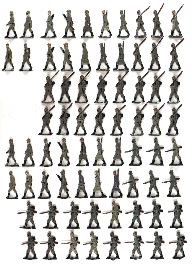 Reichswehr-Infanterie -- (Zug) -- im Marsch (im Eigenbestand mit Inhaltsangabe und Zinnfigurenmuseum Kulmbach) 1 Offizier (Zugführer) (HS 02) 1 Feldwebel (stellvertr. Zugführer) (HS 3) 1 Spielmann (als Melder) (HS 05) 1 Krankenträger (HS 07) 2 Schützengruppen bestehend je aus: 1 Gruppenführer (HS 18 oder HS 19), 7 Gewehrschützen (HS 18 oder HS 19) 2 L.-M.-G.-Gruppen bestehend je aus: 1 L.-M.-G.-Gruppenführer (HS 12), 1 Richtschützen (mit L.-M.-G.) (HS 13), 3 L.-M.-G.-Schützen (mit Kästen) (HS 14, HS 15, HS 16), 3 Bedeckungsschützen (ohne Tornister) (HS 17) |