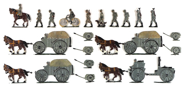 (fraglich ob komplett, Mischung von Ausmarschuniform 1914 mit Stahlhelm) Hindenburg im Mantel (Z 51) Ludendorff (U 104) Infanterie- und Artillerie-Offizier mit Karte (U 103) Artillerie-Offizier mit Scherenfernrohr, Infanterie-Offizier schreibend (U 102) Infanterie-Offizier frontal mit Fernglas (U 105) Husar mit Divisionsflagge Husar mit Trompete Husar zwei Pferde haltend (vorhanden) lediges Pferd Offizier zu Pferd mit Stahlhelm (HS 01) Fernsprecher mit Kabeltrommel knieend, Fernsprecher sprechend mit Stahlhelm Fernsprechtruppführer mit Stahlhelm (HS 10) Mann mit Fernsprechtornister und Stahlhelm (HS 09) Mann mit Kabelstange und Stahlhelm (HS 08) Zwei Sträucher (HS ?) |