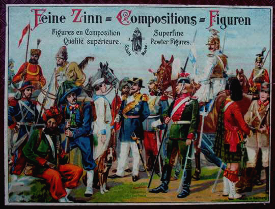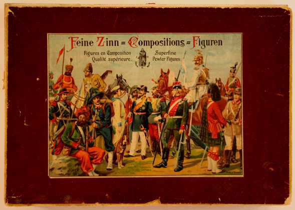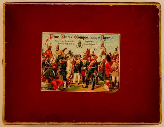 Einheitspackung für vollplastische Figuren, Karton mit Prägepapier überzogen ; 33,8 x 23,9 x 4,0 cm; Artillerie-Packung 6,3 cm hoch; weitere Kartongrößen: 32,0 x 24,6 x 4,0 cm; 35,1 x 28,6 x 4 cm; 42,7 x 32,3 x 4,0 cm für halbplastische Figuren ganz unterschiedlich mit großem oder kleinem Etikett |