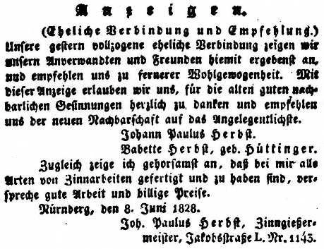Christoph Friedrich Adam Herbst hat auf dem Nürnberger Christkindlesmarkt einen eigenen Verkaufsstand. Er verkauft dort aus seiner eigenen Herstellung Einrichtungen für Puppenzimmer, Geschirr für die Puppenstube und Bleisoldaten. |