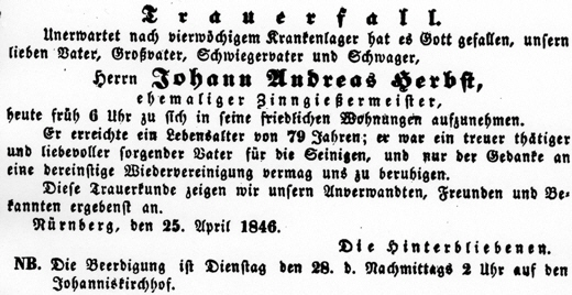 Am 25. April 1846 stirbt Johann Andreas Herbst in seinem Haus L 866 (heute Hallplatz 21). Johann Paulus Herbst ist Vorstand des Musikalischen Vereins Cäcilia. |