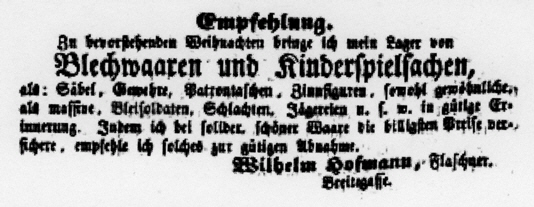 ![]() Inserat in der Bayreuther Zeitung Nro. 343 vom 11. Dezember 1859 |