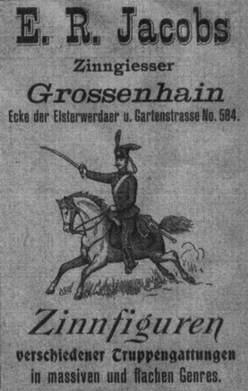 Ernst Robert Jacobs stellt auf der Ausstellung für Gewerbe, Industrie und Landwirtschaft in Großenhain (vom 24. Juni bis 20. Juli 1897) "Zinnsoldaten in verschiedenen Truppengattungen" aus. |