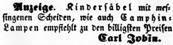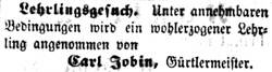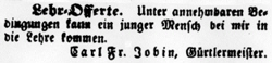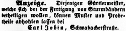 Auf der allgemeinen Deutschen Industrie-Ausstellung in München wird Isidor Jobin mit einer "Belobenden Erwähnung für billige Waaren von zweckmäßiger Form und Ausführung" ausgezeichnet. Er hat eine Musterkarte von zinnernen Fingerringen, welche zu außerordentlich billigen Preisen in den Handel kommen, und in Quantitäten nach den Barbarenstaaten abgesetzt werden (15 kr. bis 1 fl. 18 kr. das Groß), sowie ein Sortiment Fruchtkörbchen und Zinnmöbel ausgestellt, das Dutzend von 1 fl. bis 1 fl. 24 kr. Er wohnt und arbeitet in der Helmgasse 142 (Eigentümer des Hauses ist Johann Adolf Otto); im Fürther Adressbuch von 1854 ist er als Gürtlermeister verzeichnet. Carl Friedrich Jobin wohnt und arbeitet als Gürtlermeister im Haus Gustavstraße 83. |