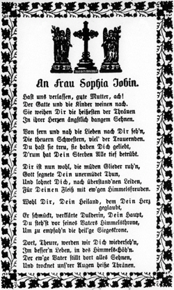 1856 | Sophia Barbara Jobin, geb. Schwarz, die Ehefrau des Carl Friedrich Jobin stirbt am 30. Januar 1856. |