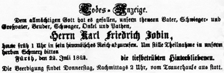 Der Zinngießergehilfe Heinrich Karl Friedrich Jobin, Sohn von Johann Paul Jobin, "ist das einzige mit Colobom behaftete Glied seiner Familie. Die angeborene Spaltbildung findet sich auf beiden Augen, das rechte ist zugleich etwas mikrophthalmisch". Carl Friedrich Jobin stirbt am 22. Juli 1862. |