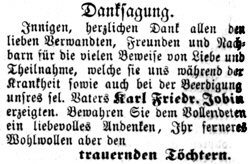 Seine Witwe Anna Johanna Margaretha Jobin heiratet am 2. Juni 1868 den Metallschläger und Galanteriewaarenverfertiger Johann Wilhelm Zöllner, nachdem dieser die Bewilligung zur Ansässigmachung und zur Verehelichung erhalten hat . |