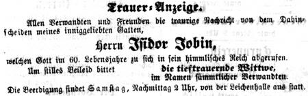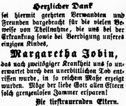 1863 | Anna Margaretha Jobin, das einzige Kind von Isidor Jobin und Anna Johanna Margaretha Jobin, geb. Heimbrecht, stirbt am 23. März 1863. |