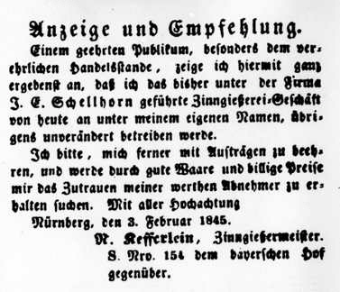 ![]() Anzeige in der Nürnberger Zeitung vom 13. Februar 1845 und dem Nürnberger Kurier vom 15. Februar 1845 |