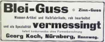 Georg Koch, Kaufmann in Nürnberg, läßt seine Firma am 15. Januar 1920 in das Firmenregister eintragen. Der Kaufmannsehefrau Therese Koch in Nürnberg ist Prokura erteilt. |