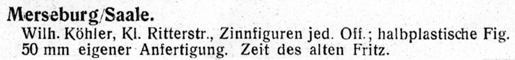 Quellen: Adressbuch Merseburg 1910 Der Standhafte Zinnsoldat - Nachrichten für Liebhaber der Zinnfigur 1929 und 1930 Ulf Leinweber: Die kleine Figur - Geschichte in Masse und Zinn, Staatliche Kunstsammlungen Kassel, 1985 Heinz Schenzle: Sigel-Bestimmungsbuch, Freunde der Plassenburg e.V. Kulmbach, 1987 Stadt Merseburg, Kulturamt, SG Archiv und Bibliothek: Ich danke Marion Ranneberg für die umfangreiche Recherche sehr herzlich! |