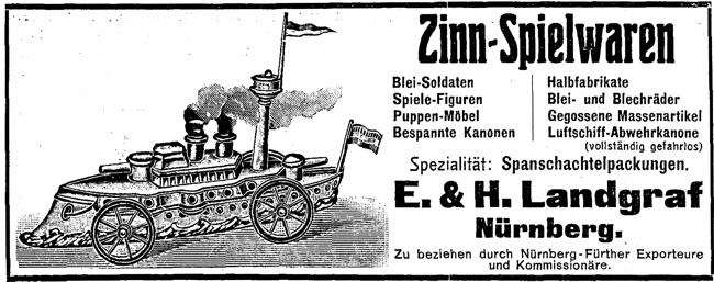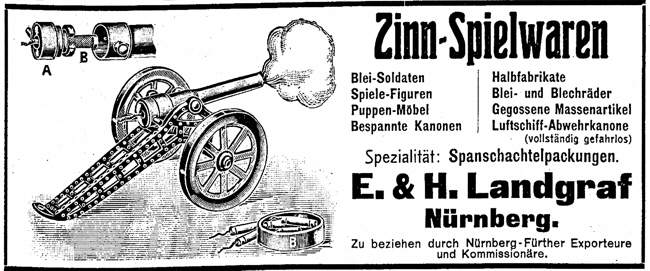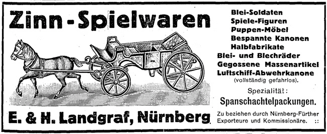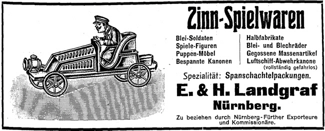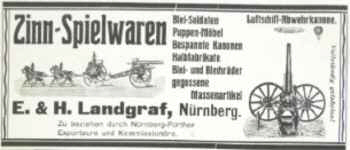 Quellen: Adressbücher der Stadt Nürnberg Handelsregister des Amtsgerichts Nürnberg Ulf Leinweber: Die kleine Figur - Geschichte in Masse und Zinn, Staatliche Kunstsammlungen Kassel, 1985 Erhard Schraudolph: Zinnspielwarenhersteller in Nürnberg und Fürth in Paradestücke, W. Tümmels, Nürnberg 2000 Erhard Schraudolph: Die Nürnberger Metall- und Zinnspielwarenfabriken der Familie Landgraf in MVGN 91/2004 Manfred H. Grieb: Nürnberger Künstlerlexikon, K. G. Saur, München 2007 (mit zahlreichen falschen Angaben) Archion: Kirchenbücher Kulmbach St. Petri, Fürth St. Johannis (Burgfarrnbach), Fürth St. Michael, Nürnberg St. Leonhard, St. Sebald Herzlichen Dank an Gisbert Freber für die Anzeige aus der Spielwarenzeitung 1910! |