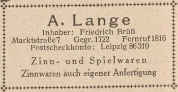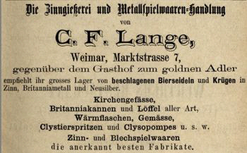 stirbt am 21. Dezember 1916. Der Zinngießer Emil Strobel, der in der Ettersburger Straße 22/I wohnt, hilft der jetzigen Inhaberin Lina Lange, geb. Wohlleben die Firma zu führen. |