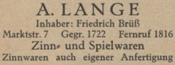 1922 | Die Firma A. Lange wird von Friedrich Jakob Brüß übernommen. |