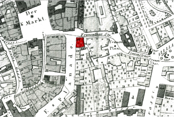 Er heiratet als Zinngießermeister am 10. November 1807 die Dorothea Ernestina Magdalena Schmidt (* 1764 in Weimar), zweite Tochter des Zinngießermeisters Johann Gottlob Schmidt. Sie bringt in die Ehe als Hauseigentümerin das Anwesen C 1 in der Frauentorstraße (später Haus Nr. 38 bzw. 36 bzw. Marktstraße 7) ein. | |