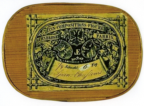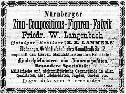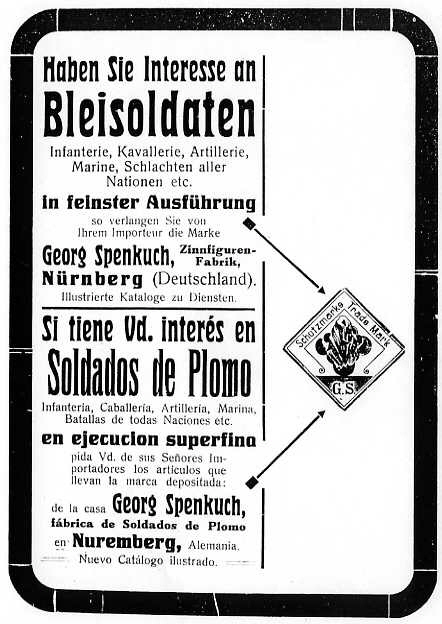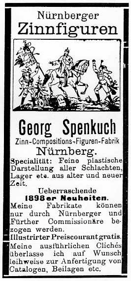 Quellen: Adressbücher der Stadt Nürnberg Stadtarchiv Nürnberg Handelsregister des Amtsgerichts Nürnberg Mündl. Auskunft Herbert Enzingmüller, Rednitzhembach (2000) Grabstelle Südfriedhof Nürnberg Abt. 47 G 17-18 Mündl. Auskunft Ida Götz (1972) und Dieter Götz, Ernst Eckert, Nürnberg; Hella Hirsch, Nördlingen und Fr. Hörtzsch, Schwabach (2000) Mündl. Auskunft Walter Merten, Berlin (1972) Deutsche Spielwarenzeitung Wegweiser für die Spiel-, Galanterie- und Kurzwarenindustrie Wegweiser für die Keramische, Bronce-, Spiel-, Kurzwarenindustrie Nürnberger Zeitung Nr. 117 vom 26. April 1844 (Google) Jahresbericht über die technischen und landwirthschaftlichen Lehranstalten in Nürnberg bekannt gemacht am Schlusse des Schuljahres 1847/48, Nürnberg (Google) Fränkischer Kurier Nr. 231 vom 19. August 1850 (Google) Nürnberg's Handel und Industrie mit besonderer Berücksichtigung der Gegenwart, Nürnberg 1852 (Google) Beilage zu Nr. 343 des Fränkischen Kuriers vom 11. Dezember 1863 (Google) Fränkischer Kurier Nr. 118 vom 27. April 1864 (digipress) Fränkischer Kurier Nr. 121 vom 30. April 1864 (digipress) Fränkischer Kurier Nr. 124 vom 3. Mai 1864 (digipress) Fränkischer Kurier (Mittelfränkische Zeitung - Nürnberger Kurier) 19. Dezember 1866 und 20. Dezember 1866 (Google) Handels-Adreßbuch von Nürnberg 1867 (Google) Adreß-Taschenbuch der Stadt Nürnberg , Selbstverlag J. Brettinger, Nürnberg 1869 (Google) Nürnberger Anzeiger Nr. 303 vom 31. Oktober 1872 (Google) Fränkischer Kurier Nr. 103 vom 25. Februar 1874 (Google) Bayrische Landes-Industrie-, Gewerbe- und Kunstausstellung in Nürnberg 1882, Offizieller Katalog, Gruppe I-XI, Bayerisches Gewerbemuseum in Nürnberg, 1882 Bayerische Landes-Industrie-, Gewerbe- und Kunstausstellung Nürnberg 1882, Verzeichnis der prämiierten Aussteller nebst Mitteilungen über das Preisgericht, München 1882, veröffentlicht am 25.8.1882, Verlag von Rudolf Mosse, Nürnberg/München Internationale Ausstellung für Colonieen und Export zu Amsterdam 1883 - Spezial-Katalog der Deutschen Abteilung Bayerische Landes-Industrie-, Gewerbe- und Kunst-Ausstellung Nürnberg 1896, Offizieller Katalog, Bayerisches Gewerbemuseum Nürnberg 1896 (Stadtbibliothek Nürnberg online) Bayerische Landes-Industrie-, Gewerbe- und Kunst-Ausstellung Nürnberg 1896, Verzeichnis der pämiierten Aussteller, Bayerisches Gewerbemuseum Nürnberg 1896 Centralblatt für die Kurz-, Galanterie-, Spiel-, Papier- & Schreibwaren-Branche Nr. 10 vom 30. Mai 1896 (Google) Theodor Hampe: Der Zinnsoldat - ein deutsches Spielzeug, Verlag Herbert Stubenrauch, Berlin 1924 Der Standhafte Zinnsoldat - Nachrichten für Liebhaber der Zinnfigur, Joachim Ritter, Markkleeberg b. Leipzig - 3. Jahrgang 1930 Curt F. Kollbrunner: Zinnfiguren - Zinnsoldaten - Zinngeschichte, Hirmer-Verlag München 1979 Hans Henning Roer: Bleisoldaten, Callwey 1981 Ulf Leinweber: Die kleine Figur - Geschichte in Masse und Zinn, Staatl. Kunstsammlung Kassel 1985 Heinz Schenzle: Sigel-Bestimmungsbuch, Freunde der Plassenburg e. V. Kulmbach, 1987 Hans Henning Roer: Alte deutsche Spielfiguren in Blei, Rommersheim 1993 Erhard Schraudolph: Die Nürnberger Zinn-Compositions-Figuren-Fabrik, in: MVGN 80 (1993) Erhard Schraudolph: Die Nürnberger Zinn-Compositions-Figuren-Fabrik, in: Figurina Helvetica, 53. Jahrgang (1994) Erhard Schraudolph: Die Nürnberger Zinnfigurenfabrik Georg Spenkuch, in: MVGN 82 (1995) Erhard Schraudolph: Die Zinnfigurenfabrik Georg Spenkuch, in: Figurina Helvetica, 56. Jahrgang (1997) Erhard Schraudolph: Zinnspielwarenhersteller in Nürnberg und Fürth, in: Paradestücke, Tümmels 2000 Ich danke Christian Luscher, Osnabrück, für das Foto der Spanschachtel nach 1883 und der Figurengruppe zur ´Packung Völkerschlacht bei Leipzig! Ich danke Wolf-Rüdiger Bonk sehr herzlich für die Fotos der Flachfiguren-Packung! Ich danke Uwe Bachmann sehr herzlich für die Fotos der Packung "Deutsche Kolonial-Truppen - Buren"! Ich danke Norbert Eckes sehr herzlich für die Fotos aus seiner Samlung! Archion (Kirchenbücher Nürnberg Heilig Geist, St. Johannis, St. Sebald und St. Lorenz) Matricula (Kirchenbuch Nürnberg Unsere Liebe Frau)