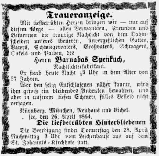 Das Geschäft ist zum 17. August 1938 in den Alleinbesitz des Gesellschafters Jean Schmidt übergegangen, der es unter unveränderter Firma "Georg Spenkuch, Nürnberg" weiterführt. |
