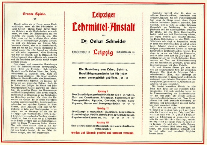 Mittelblock: Leipziger Lehrmittel-Anstalt von Dr. Oskar Schneider Schulstrasse 12 Leipzig Die Ausstellung von Lehr-, Spiel- u. Beschäftigungsmitteln ist für jedermann unentgeltlich geöffnet. Katalog I über Beschäftigungsmittel für Kinder von 6 - 15 Jahren, Mal- und Tuschkasten, Reisszeuge, Sammlungen zur Naturgeschichte, Aquarien, Terrarien, Globen, Turn-Apparate, Rasen- und Bewegungsspiele Katalog II über Dampf- u. mechanische Maschinen, Lokomotiven, Eisenbahnzüge, Schiffe, elektrische u. optische Apparate, Experimentier-Kasten etc. etc. Katalog III über selbstspielende Musikwerke mit auswechselbaren Notenscheiben werden auf Wunsch postfrei und umsonst versandt. |