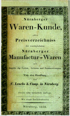 1838 | In der "Nürnberger Waren-Kunde, oder Preisverzeichniss der vorzüglichsten Nürnberger Manufactur-Waren mit Angabe der Sorten, Grössen und Nummerirungen. Von der Handlung von C. Leuchs & Comp. in Nürnberg" wird auf der Seite 93 unter 2) "zinnener Hausrath" und auf Seite 119 werden unter Zinnspielwaren "Soldaten, Jäger, Schäfer, Gärten, Viehweiden, Dörfer, Menagerien, Gänse, Hühner et. etc." angeboten. |