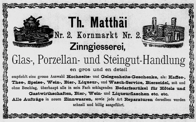 Carl Theodor Matthäi stirbt am 23. Februar 1901. Ferdinand Conrad Matthäi, der Preßvergolder ist, wohnt in Leipzig-Reudniz. |