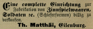 Zinnspielwaren und Zinnfiguren: nicht bekannt; ob und an wen Carl Theodor Matthäi seine Schieferformen verkauft hat, ist nicht zu eruieren. |