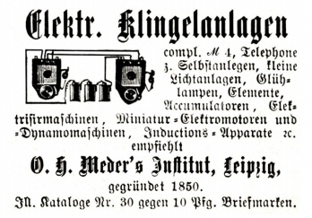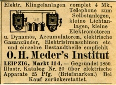 | 1906 | Im Adressbuch ist für die Firma O. H. Meder eingetragen: Institut für Optik und Physik, Photographische Apparate, Elektrische Schwachstromartikel, Lehrmittel, Phonographen. |