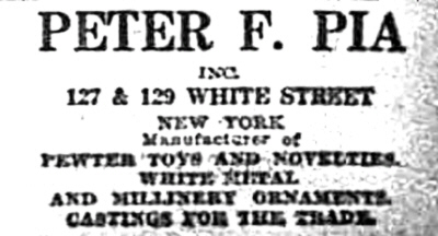 1917 | New York Directory 1917 und 1918: Ernest Pia - pres Peter F. Pia Inc. - 127 White Street John Pia - sec-treas Peter F. Pia Inc. - 127 White Street Peter F. Pia Inc. - pewter toys - 129 White Street |