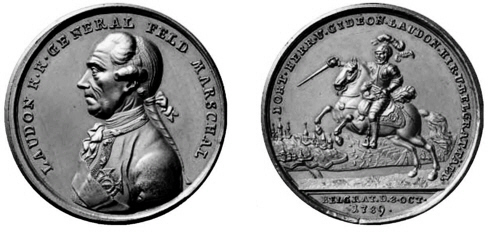 Zinnmedaille von Johann Christian Reich d. Ä. auf die Eroberung von Belgrad am 8. Oktober 1789. Links Brustbild des kaiserlichen Generals und Feldmarschalls Gideon Ernst, Freiherr von Laudon in Uniformrock, mit Ordensband und Brustkreuz. Rechts Krieger in voller Rüstung mit gezogenem Schwert auf einem springenden Hengst, im Hintergrund die Donau und auf dem jenseitigen Ufer die befestigte Stadt mit den rechts vorgelagerten Schanzungen und dem Feldlager der Belagerer. Ø 47,23 mm aus: Fritz Rudolf Künker - Münzhandlung - Katalog zur 116. Auktion am 27. September 2006 (Google books) |