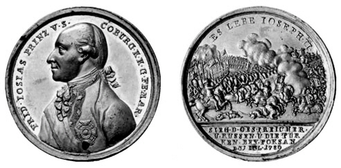 Zinnmedaille von Johann Christian Reich d. Ä.: Die Schlacht bei Foksan 1789 Joseph II., 1765 - 1790, auf den bei Foksan errungenen Sieg österreichischer und russischer Streitkräfte über die Türken am 31. Juli. links Brustbild des Feldherrn Friedrich Josias von Sachsen-Coburg-Saalfeld in Uniformrock mit Ordensband und Ordenskreuz. Rechts von rückwärtiger Artillerie unterstützte österreichisch-russische Kavallerie und Infanterie auf türkische Reiterei treffend, am Horizont rechts Ansicht des befestigten Foksan (heute Rumänien). Ø 47,47 mm aus: Fritz Rudolf Künker - Münzhandlung - Katalog zur 116. Auktion am 27. September 2006 (Google books) |
