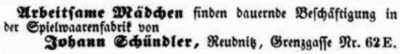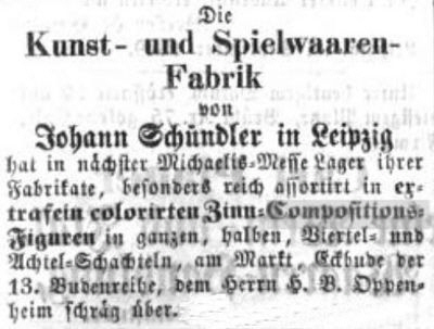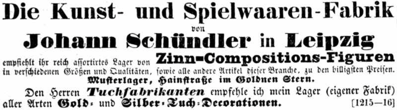 Erstmals ist Johann Christoph Schündler, der in der Hainstaße 25 eine Fabrik für Gold- und Silberbuchstaben zu Tuchdecorationen betreibt und in der Katharinenstraße 19 wohnt, im Adressbuch verzeichnet. Er stellt auch Zinn-Compositions-Figuren her. |