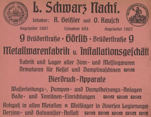 | 1893 | Die Firma nennt sich nun "Zinn- und Messingwaaren-Fabrik, Spritzen-, Pumpen- und Wasserleitungs-Bau-Anstalt" und inseriert erstmalig im Görlitzer Adressbuch: |