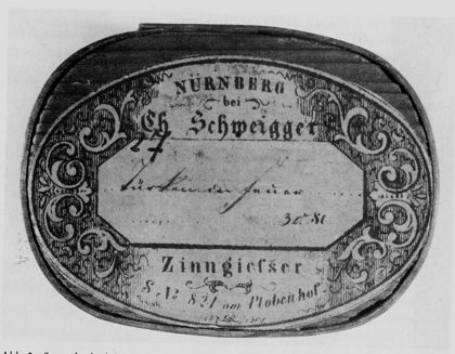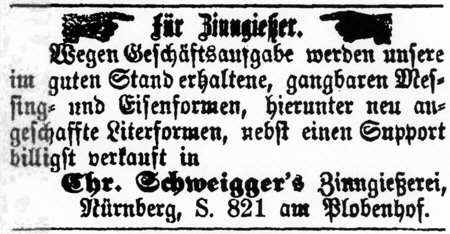 Er firmiert mit seiner Firma Christ. Schweigger als Zinngießer und Zinnfigurenfabrikant. |