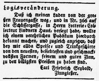 und die Adressen von Moritz Seybold den verschiedenen Zinngießern der