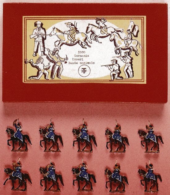 ca. 1950 | Der Sohn des Gründers, Gianluigi Testi, ist ein großer Sammler von Spielzeugsoldaten und beginnt unmittelbar nach dem 2. Weltkrieg Figuren der unterschiedlichsten Hersteller, bunt gemischt (z. B. Pferde und Reiter von verschiedenen Firmen, Flachfiguren, halb- und vollplastische Figuren kombiniert) teils mit der ursprünglichen Fabrikbemalung, teils neu bemalt, in Kartons mit seinem Firmen-Etikett zu vertreiben. |