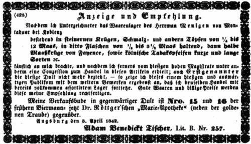 | Anzeige im Augsburger Tagblatt No. 92 vom 4. April 1842 und No. 94 vom 6. April 1842, in der Augsburger Postzeitung No. 98 vom 8. April 1842 und No. 101 vom 22. April 1842 sowie im Intelligenz-Blatt No. 28 vom 6. April 1842 und No. 30 vom 13. April 1842 | |